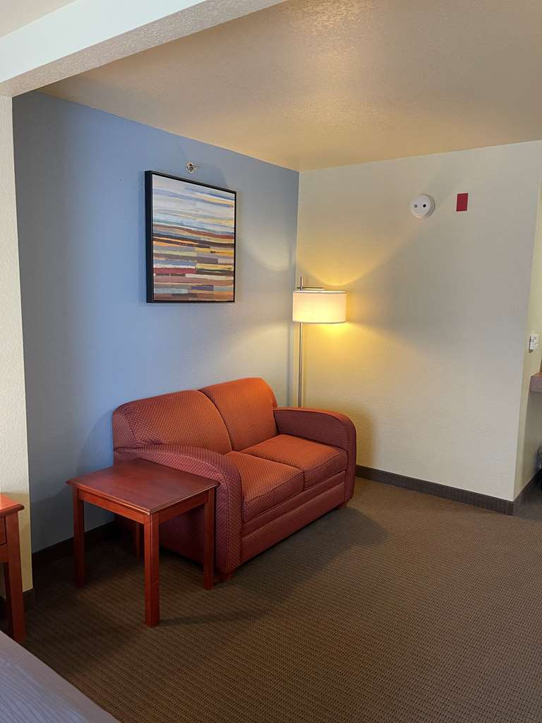 We found the room adequately sized. A nice soft chair as well as a desk chair. Television remote worked consistently. A nice free breakfast. The lobby was nice and we were given use of the...