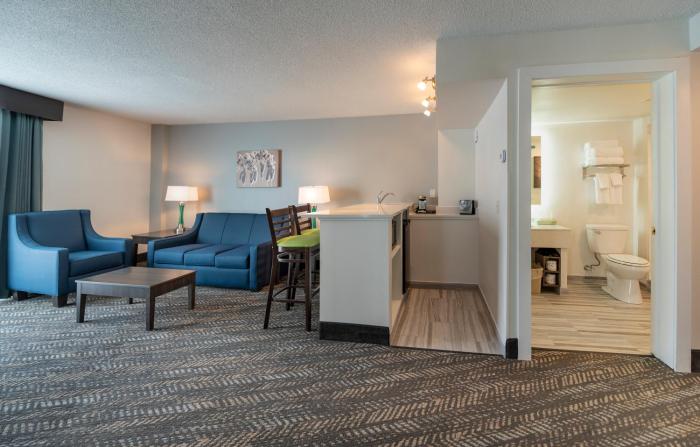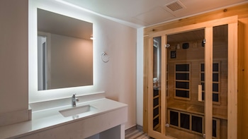 suite-1 king bed, non-smoking, separate bedroom, sofabed, kitchenette, sauna, walk in shower, full b