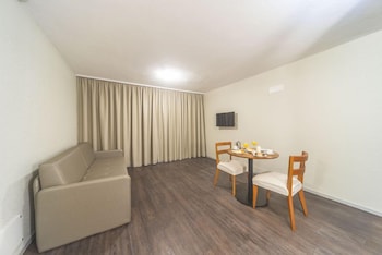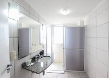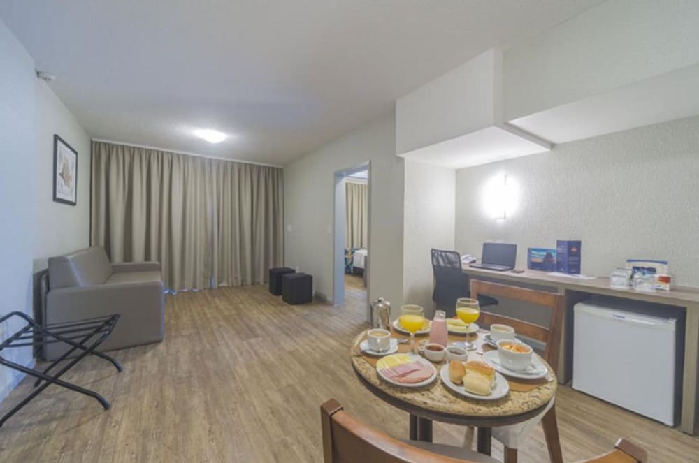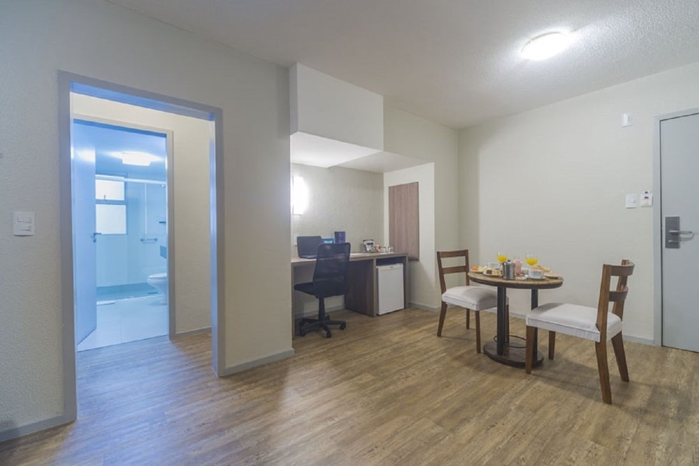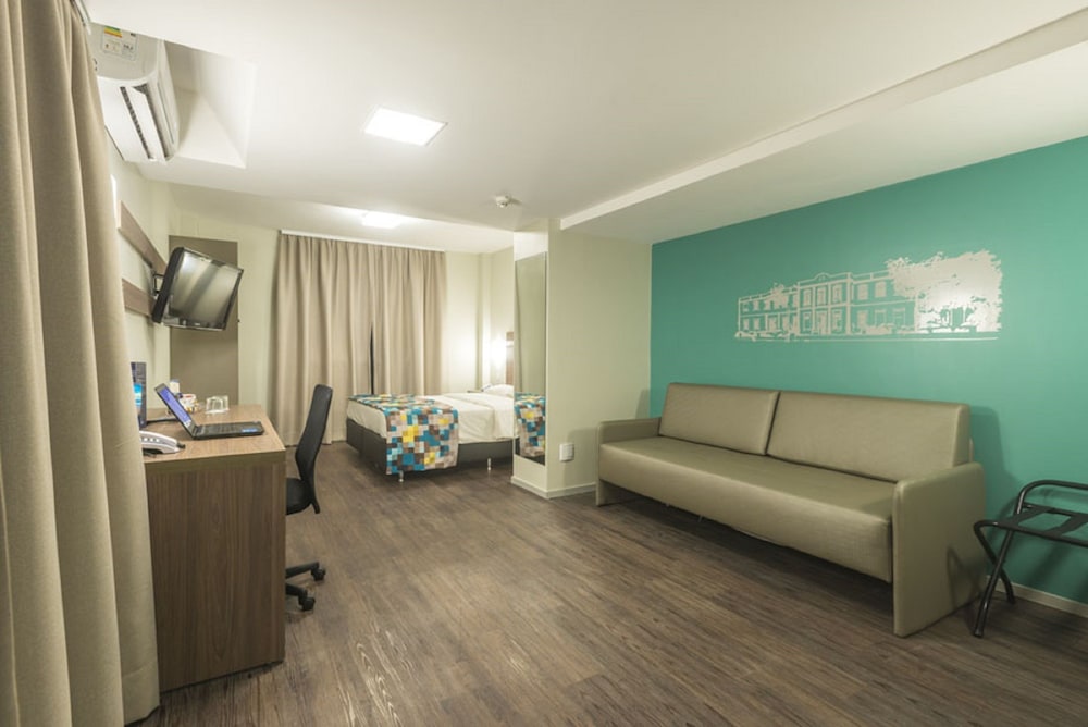 This hotel has large bedrooms (really large) with great king size bed. This is a good bedroom if you need to rest during the day because it's dark. It's located in a good area close to the Hercílio...