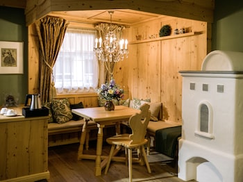 What a charming hotel. No children which makes for perfect peace. Beautiful surrounding mountains. A swimming pool area with spectacular views. Beautiful food, including 5 course evening meals...