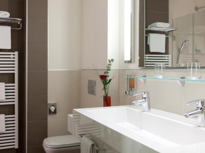 This hotel has clean rooms and special architection.calm place with beautiful garden. You must pay 10-15 euro per night for roof parking but other parkings are free. Free wifi in rooms but our room...