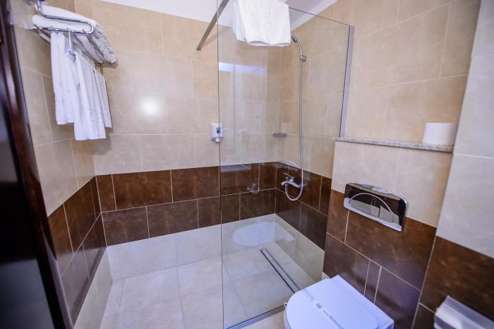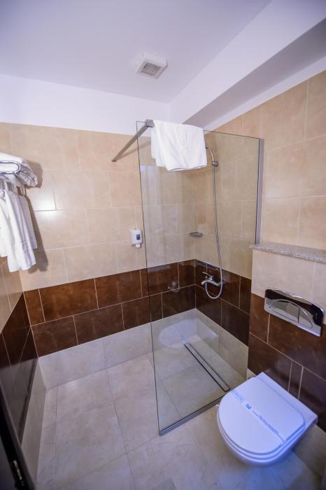 Air conditioning and central heating ensure that rooms maintain comfortable temperatures. A balcony is included as a standard feature in some rooms. All rooms are carpeted and include a double bed or a king-size bed. Children's beds and extra beds can be requested for younger guests. A safe and a minibar are also available. Extra comforts include a tea/coffee station. A telephone, a television with satellite/cable channels and WiFi provide all the essentials for a comfortable vacation. Guests will also find slippers in their rooms. Bathrooms are equipped with a shower and a bathtub. A hairdryer, a vanity mirror and bathrobes are provided. Guests can also reserve wheelchair-friendly rooms with wheelchair-accessible bathrooms. The hotel has family rooms and non-smoking rooms.
