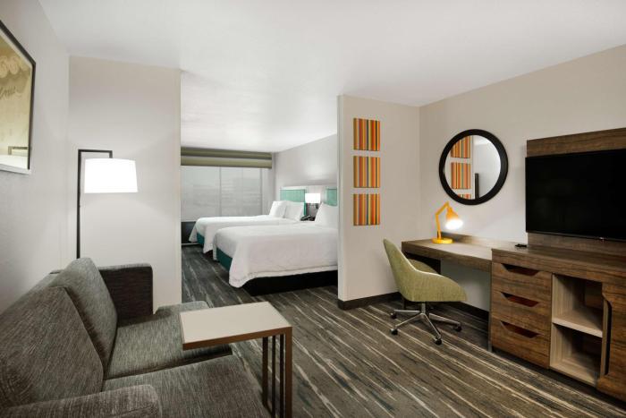 Large Room, needs refurbishing. Room pretty clean, but carpets in lobby,halls, and bedroom are dirty, Walls,furniture, beds, are tired. Not very inviting. Breakfast is fair, typical Hampton. OK...