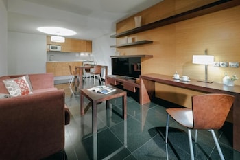 It is awesome.The buffet breakfast has delicious food.The hotel offers a shuttle bus.The apartment is like you see in the pictures.Great sofa,big TV,microwave,Kitchenette with dinnerware.Very modern...