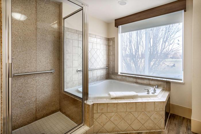 Stayed here for two nights for family reunion. We got a king suite with whirlpool. Liked the large lay out of the room and it was very clean and quiet. Bath area was very roomy and water pressure was...