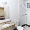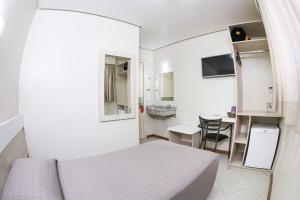Estou hospedado num quarto bem apertado, mas que oferece um banho agradável, por não haver aperto ao redor do chuveiro. Pequeninho, porém limpo e bem estruturado, com espelhos, um armário, uma mesa...