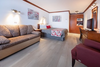 The room was very big and clean. It's very quiet. It was nice to have a kitchen with everything so you can cook. The hotel is very closed to the main street with the restaurants. The wifi was pretty...