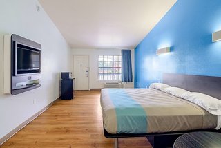 We stayed here overnight on our way to Shreveport La. We love that motel 6 has wooden floors instead of musty carpet. This room was relaxing with the main wall painted a ocean blue. Beds we're...