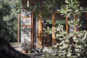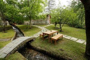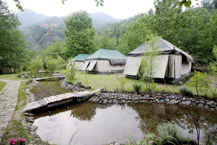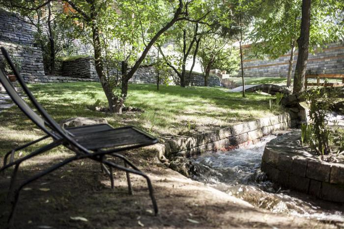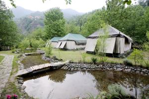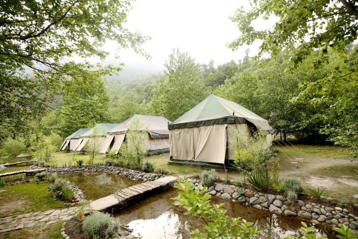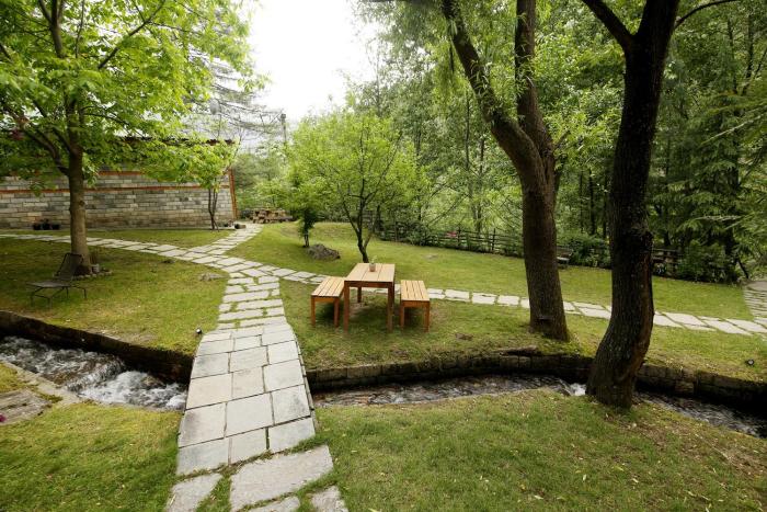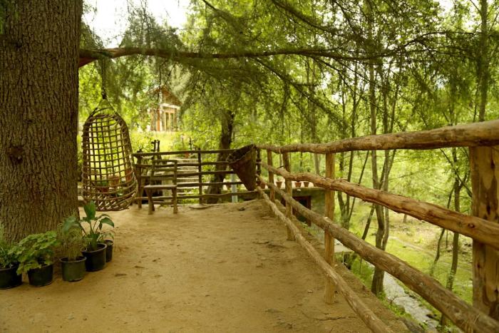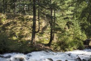 Amidst tall trees and a flowing stream.