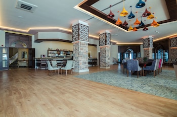 Hotel beautiful but full of Russians only 3 English people there and that was us nothing outside hotel food cold and taxi ride 170 lira to next town was ok for families who want an early night and...